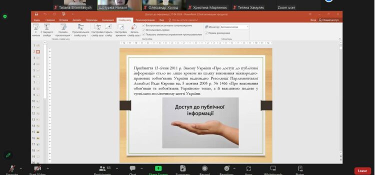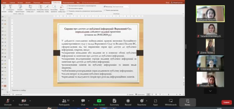Актуальну та досить широку тему лекторка вміло структурувала та представила слухачам найцікавіші кейси що стосуються особливостей подання та отримання запитів, їхньої структури та порядку, також розповіла про тонкощі у сфері законодавчого регулювання можливостей отримання різних типів інформації в умовах воєнного стану.