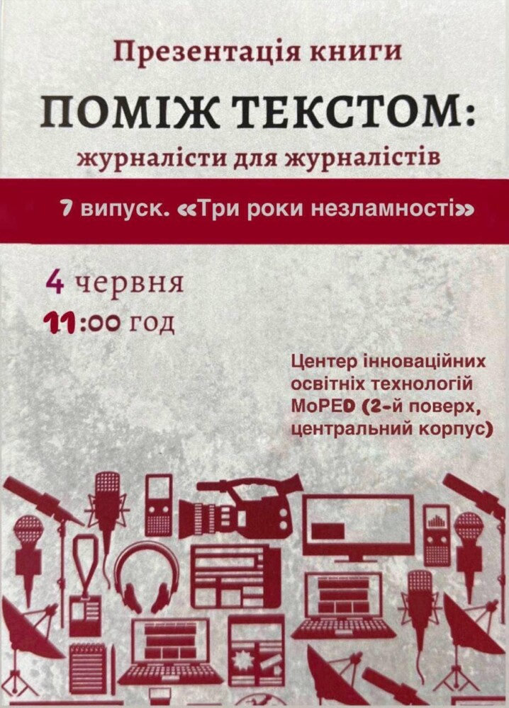 4 червня об 11:00 год в 233 аудиторії (MOPED) відбудеться презентація сьомого випуску книжки «ТРИ РОКИ НЕЗЛАМНОСТІ», яка вийшла в межах видавничого проєкту «Поміж текстом: журналісти для журналістів». Захід приурочений Дню журналіста України та 85-річчю університету. Вміщено 31 інтерв’ю, які Читати далі