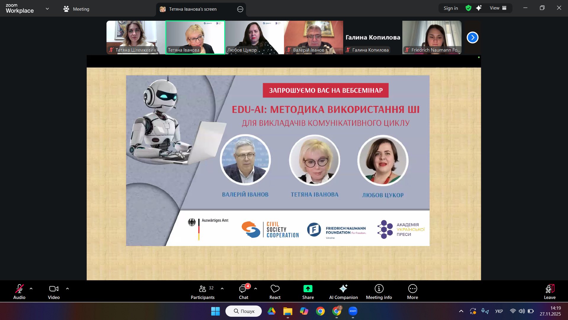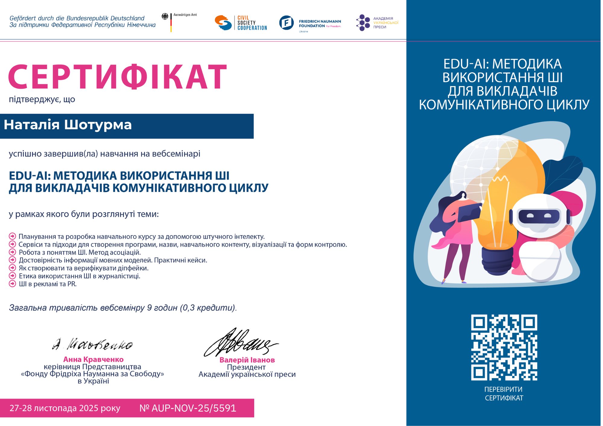 Викладачки Наталія Шотурма та Тетяна Шлемкевич пройшли вебсемінар «EDU-AI: Методика використання ШІ для викладачів комунікативного циклу», організований Академією Української Преси спільно з Фондом Фрідріха Науманна за Свободу. Отримані інструменти інтегруються в навчальні курси.