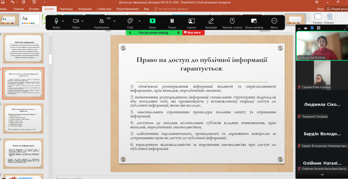 Темою двогодинного інтенсиву стало «Забезпечення доступу до публічної інформації в органах місцевого самоврядування». Під час заняття особливу увагу було приділено правовим аспектам роботи розпорядників інформації в умовах воєнного стану.